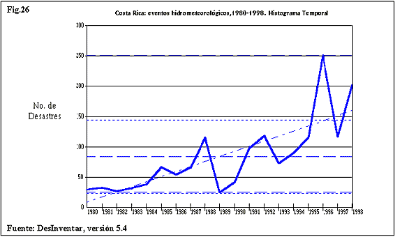 Finalmente, en lo que toca al período 1980-1998, el mes de octubre - mes de huracanes y uno de los más lluviosos en la vertiente pacífica del país – y el año 1996 – año en que el huracán César impactó indirectamente a Costa Rica, y en el cual se reportó una Niña leve – aparecen como los que en las últimas dos décadas reúnen la mayoría de los eventos hidrometeorológicos ocurridos en Costa Rica (figs. 25 y 26).